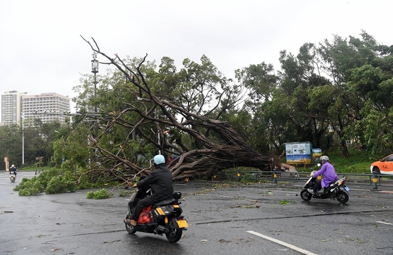 8月25日,在海南省三亚市吉阳区,市民从倒伏的树木前经过。