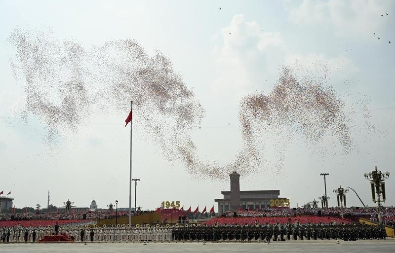 9月3日,纪念中国人民抗日战争暨世界反法西斯战争胜利80周年大会在北京隆重举行。这是纪念大会现场放飞气球。