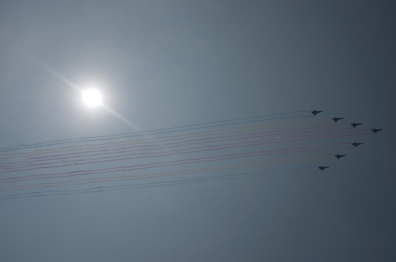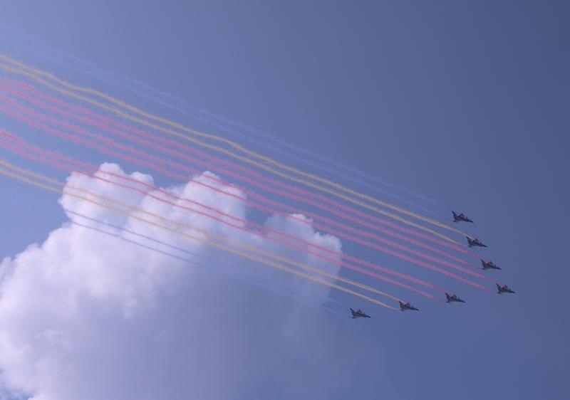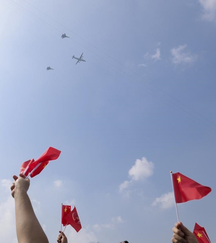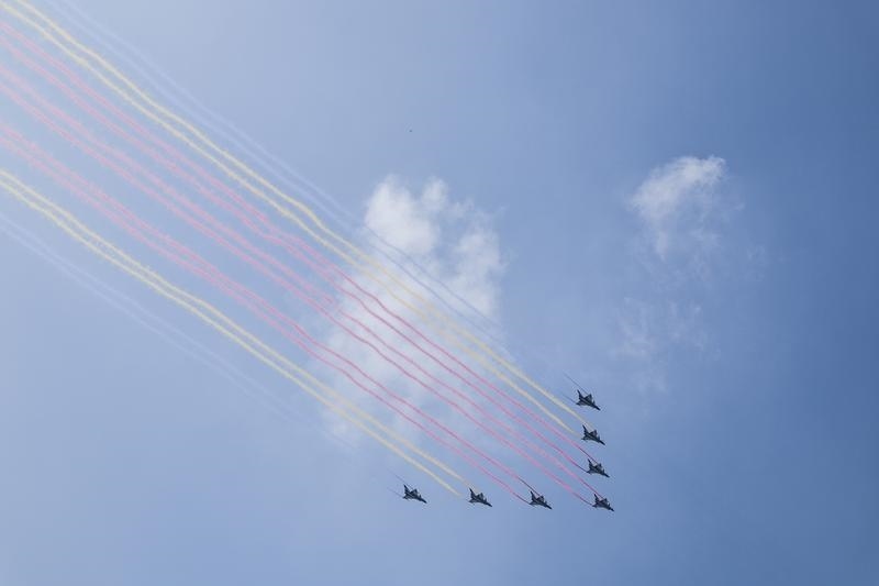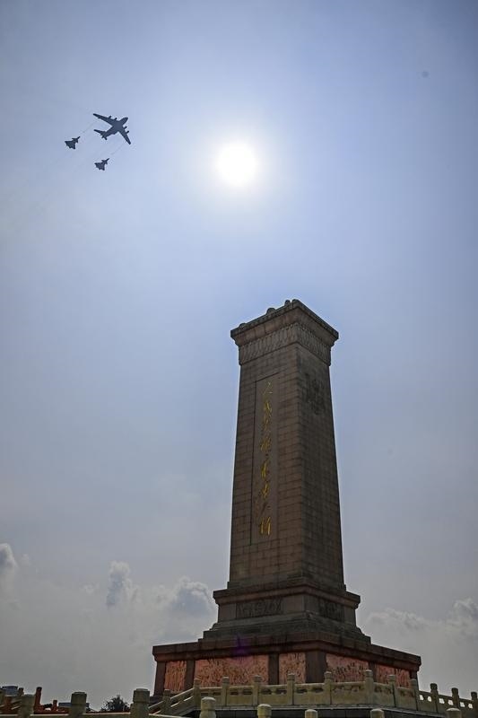 9月3日,纪念中国人民抗日战争暨世界反法西斯战争胜利80周年大会在北京隆重举行。这是教练机梯队接受检阅。