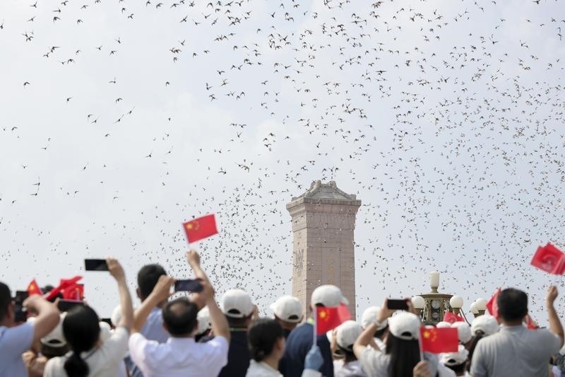 9月3日,纪念中国人民抗日战争暨世界反法西斯战争胜利80周年大会在北京隆重举行。这是纪念大会现场放飞鸽子。