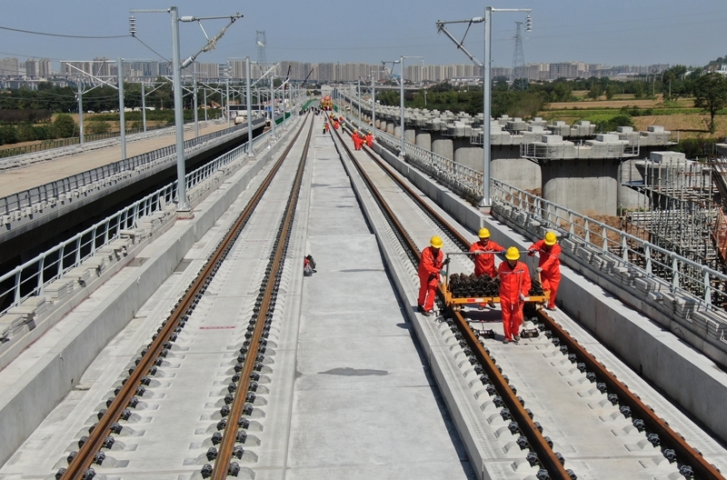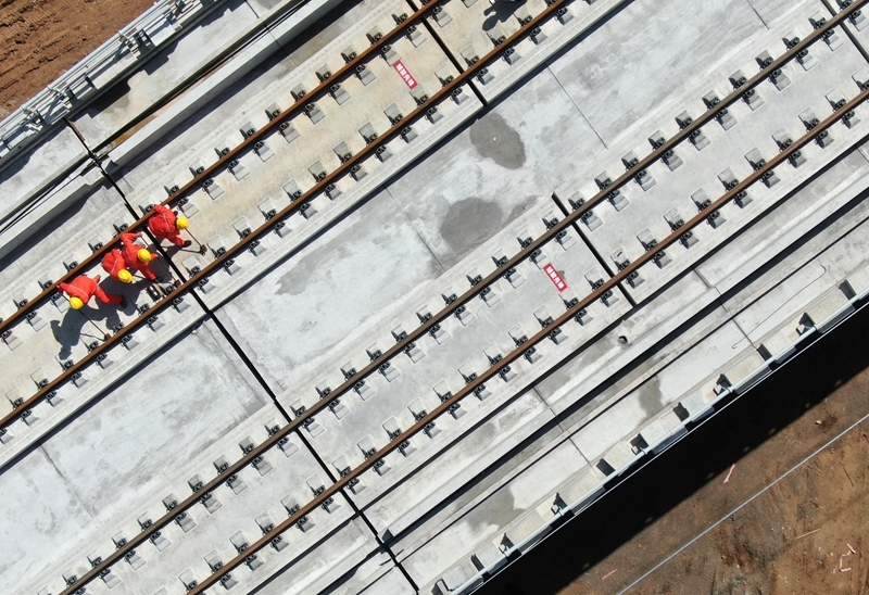 9月8日,施工人员在西十高铁西安东至蓝田区间铺设无缝钢轨(无人机照片)。