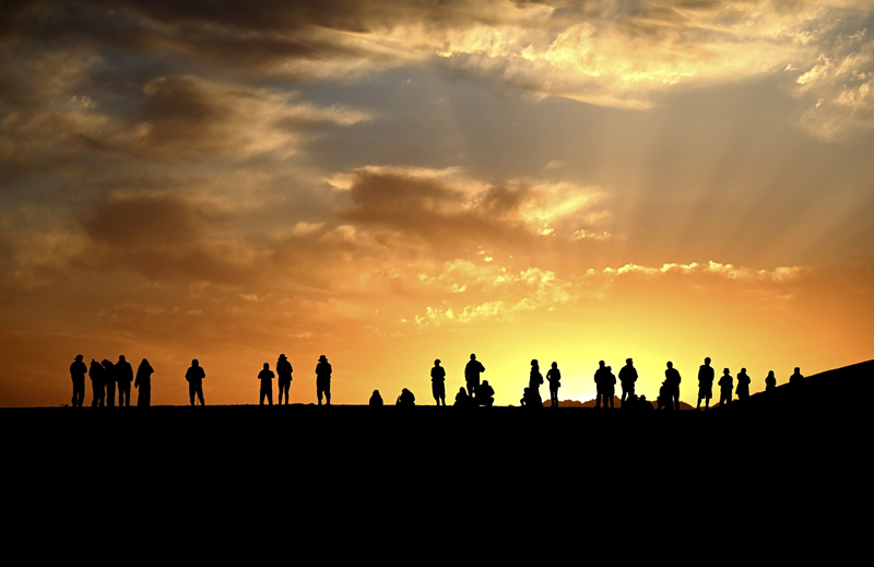 10月2日清晨,游客在甘肃省敦煌市鸣沙山月牙泉景区观赏大漠日出美景。