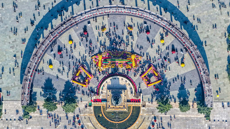 10月2日,游客在黑龙江省哈尔滨市防洪胜利纪念塔广场游玩(无人机照片)。