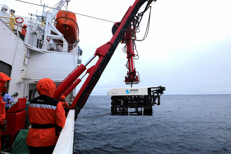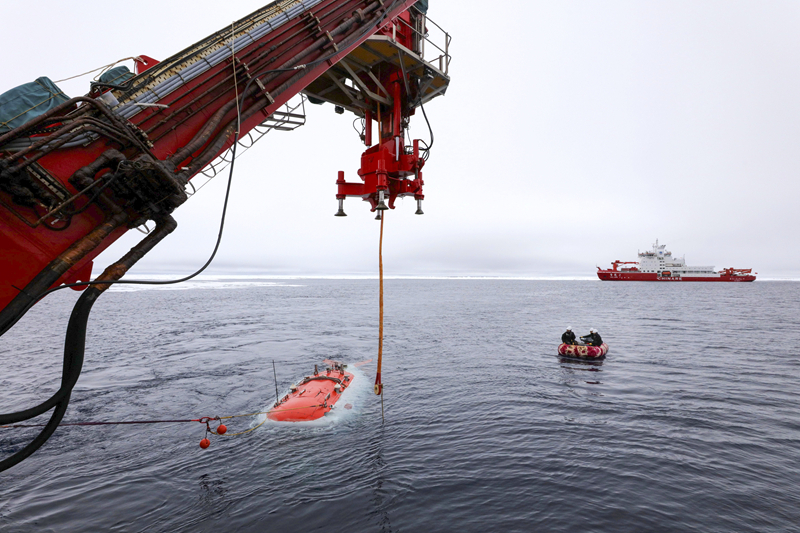 8月7日,科考队员将ROV(无人遥控潜水器)放入水中。