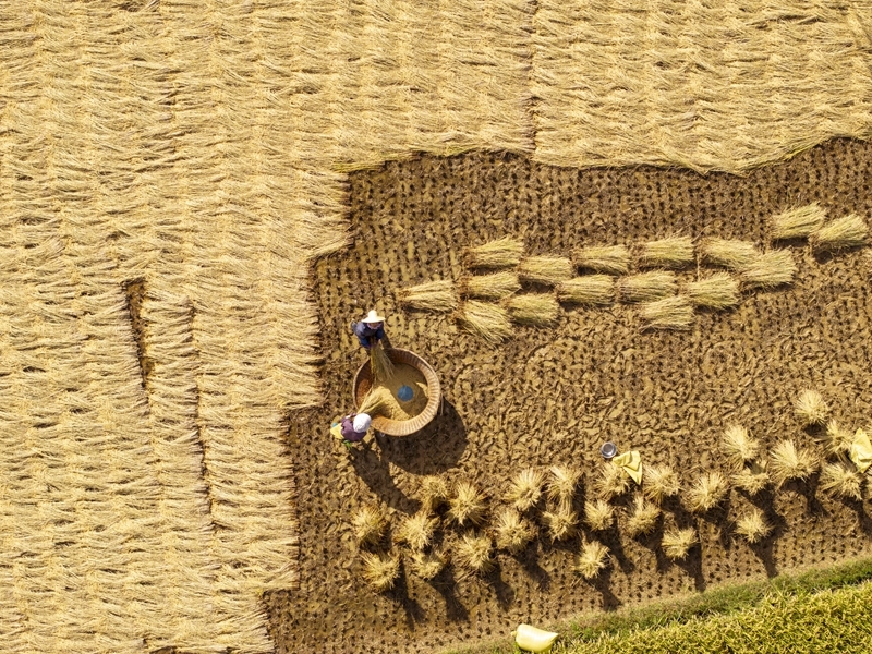 10月3日,农民在云南省大理白族自治州洱源县右所镇收割水稻(无人机照片)。