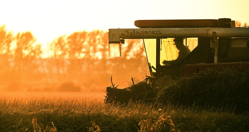 10月3日,农户在北大荒集团黑龙江八五六农场有限公司第五管理区抢收水稻(无人机照片)。