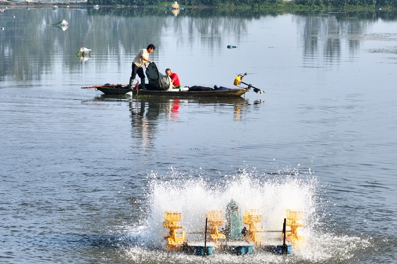 10月4日,蟹农在江苏省宝应县夏集镇王营村养殖基地捕捞螃蟹(无人机照片)。