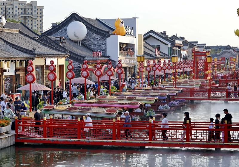 10月3日,游客在河北省唐山市丰南区河头老街景区游玩。
