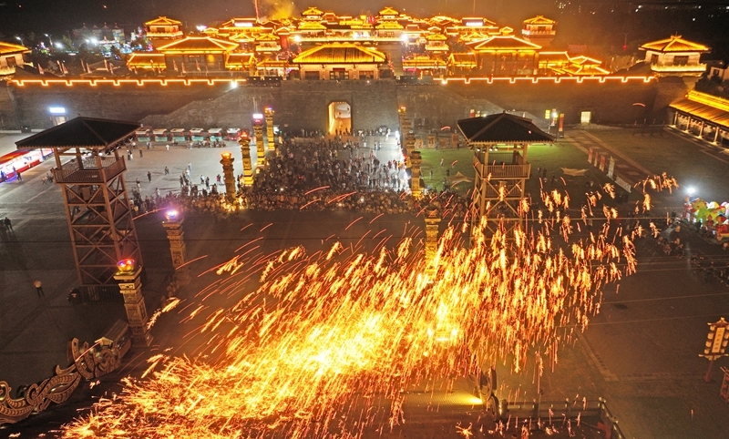 10月3日晚,游客在山东省临沂市郯城县郯国古城景区观看打铁花(无人机照片)。