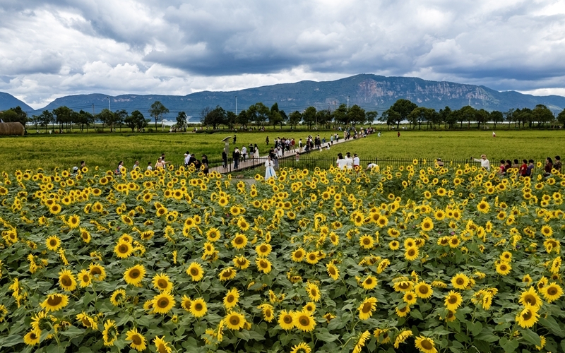 10月4日,游客在昆明滇池边的福保村欣赏向日葵(无人机照片)。