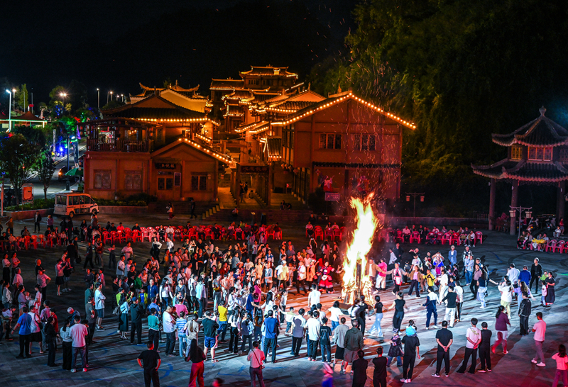 10月5日晚,在贵州省晴隆县阿妹戚托小镇,游客与当地群众围着篝火共舞。