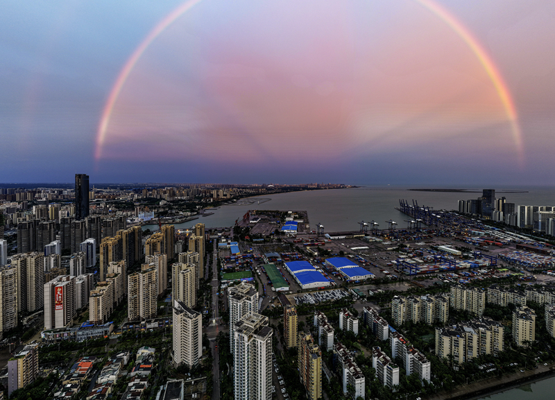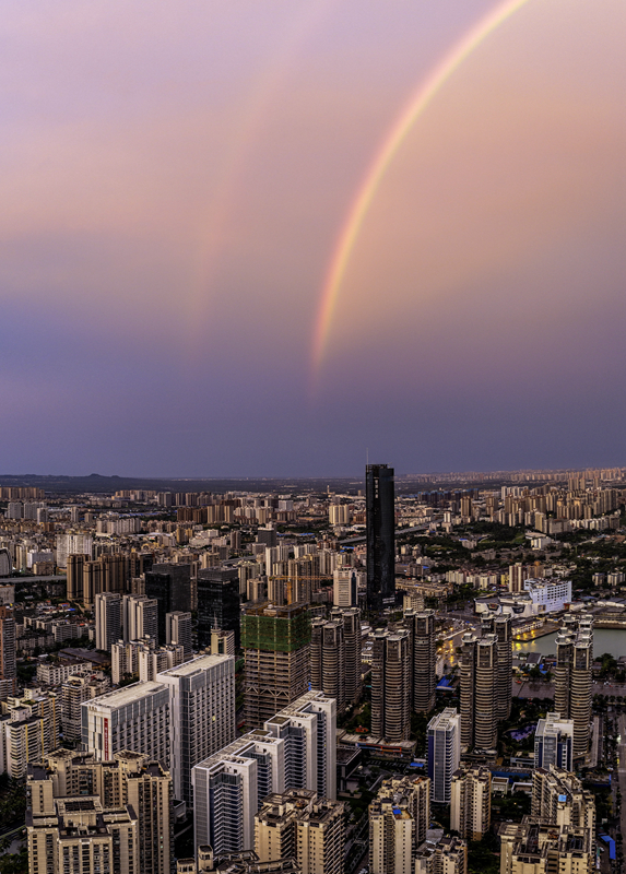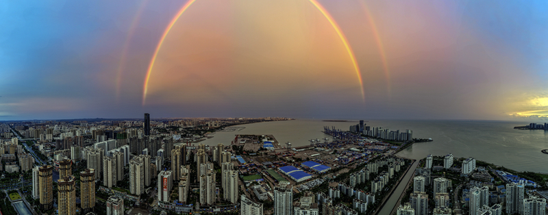 10月6日清晨,海口市上空出现彩虹。今年第21号台风“麦德姆”对海口的影响趋于结束,海口城区逐步恢复正常秩序。