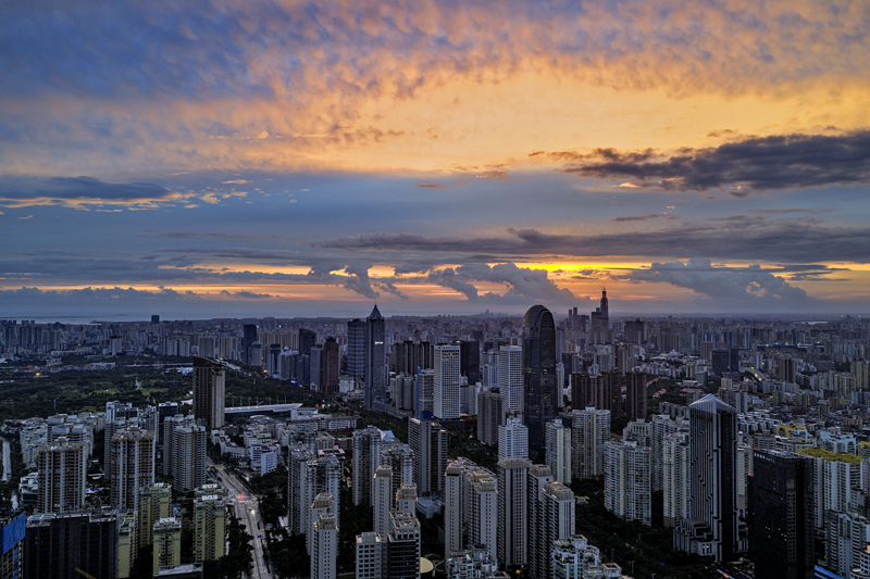 10月6日清晨拍摄的朝霞映照下的海口城区。