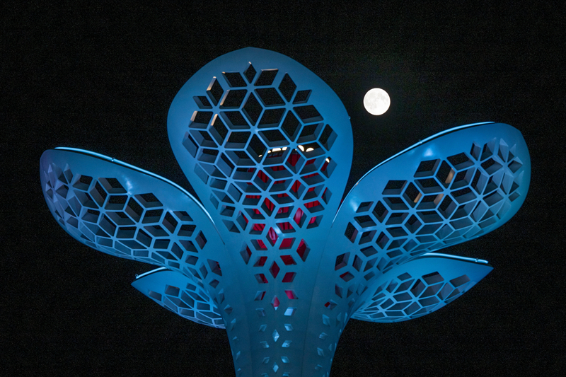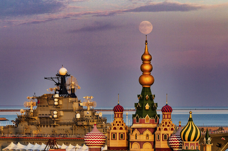 10月6日在天津市滨海新区泰达航母主题公园拍摄的中秋满月(无人机照片)。
