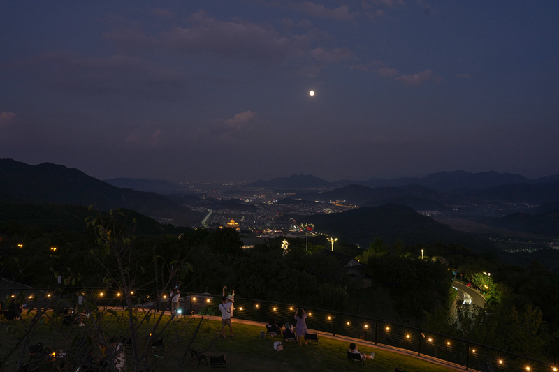 10月6日,游客在浙江省宁波市奉化区溪口镇东山村一处观景平台赏月。