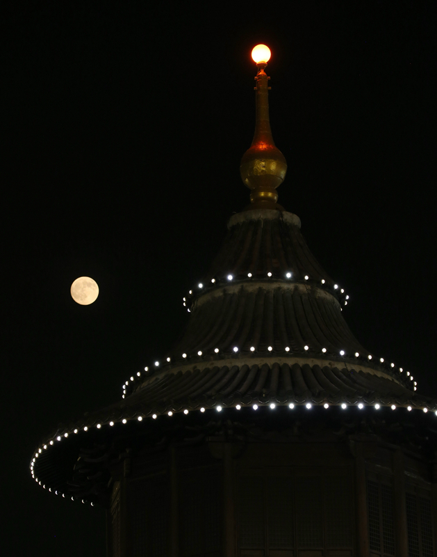 这是10月6日在北京故宫角楼附近拍摄的月亮。