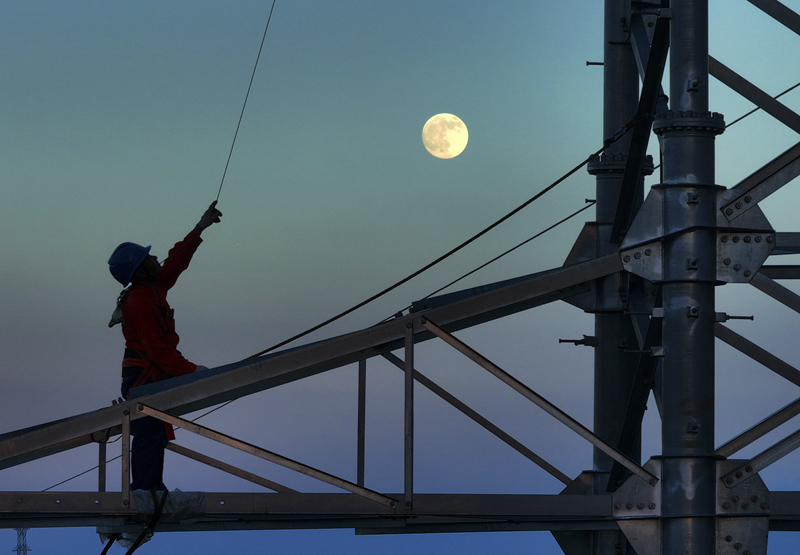 10月6日,在湖南省衡阳市雁峰区,高塔架线工人在月光的映射下施工(无人机照片)。
