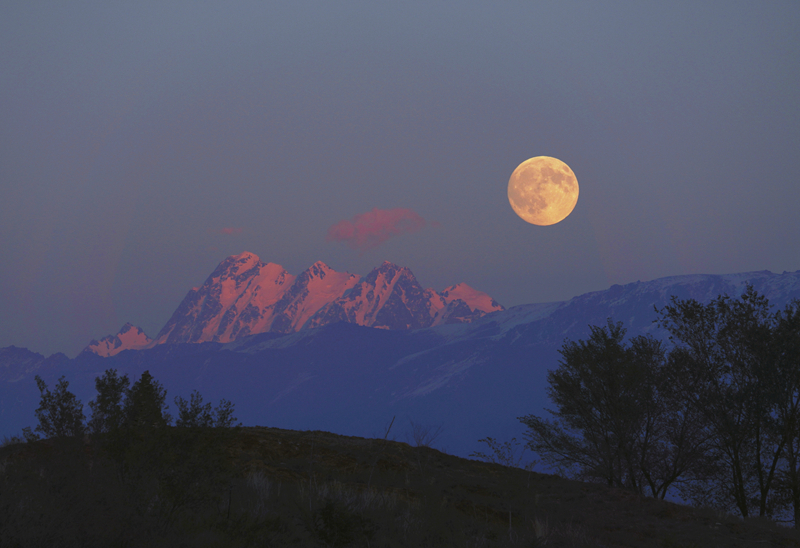 10月6日在新疆乌鲁木齐拍摄的天山山脉上空的中秋圆月。