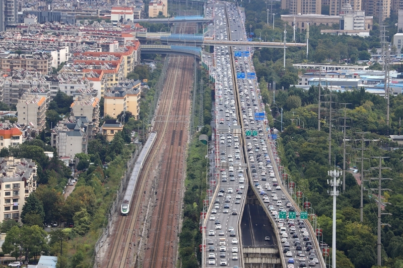 10月7日,车辆行驶在江苏省南京市应天高架上(无人机照片)。