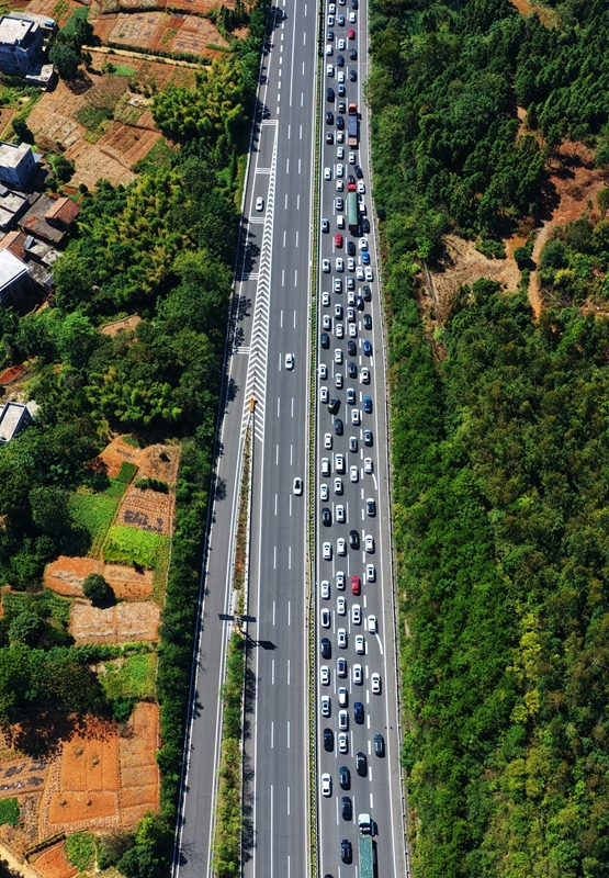 10月7日,车辆在许广高速湖南省郴州市嘉禾县路段缓慢行驶(无人机照片)。