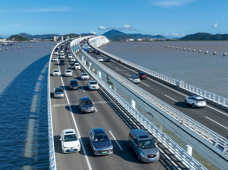 10月7日,在浙江省舟山市普陀区,返程车辆行驶在朱家尖海峡大桥上(无人机照片)。