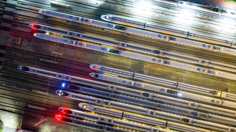 10月10日,动车组列车驶出南京动车段南京南动车运用所(无人机照片)。