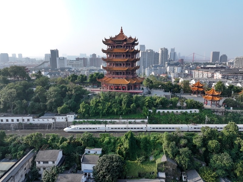 10月10日,动车组列车经过湖北省武汉市黄鹤楼(无人机照片)。