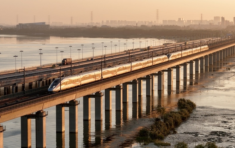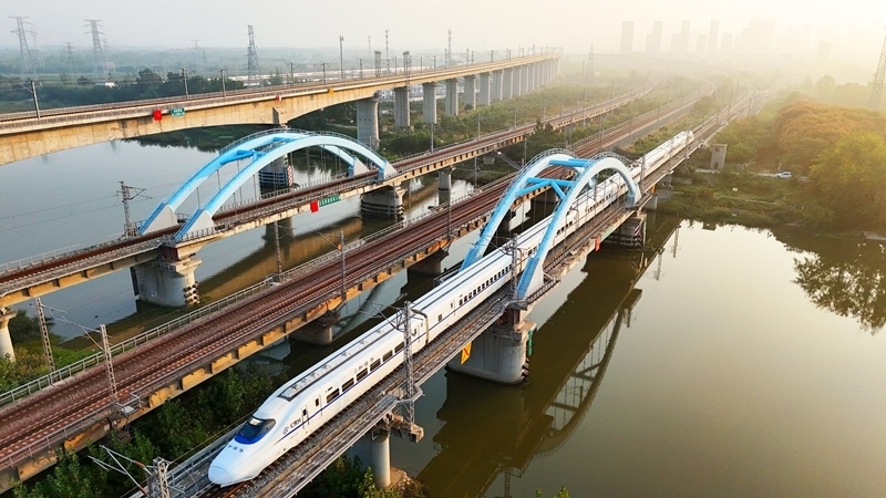 10月10日,在江苏省昆山市,动车组列车通过京沪高铁丹昆特大桥阳澄湖段(无人机照片)。