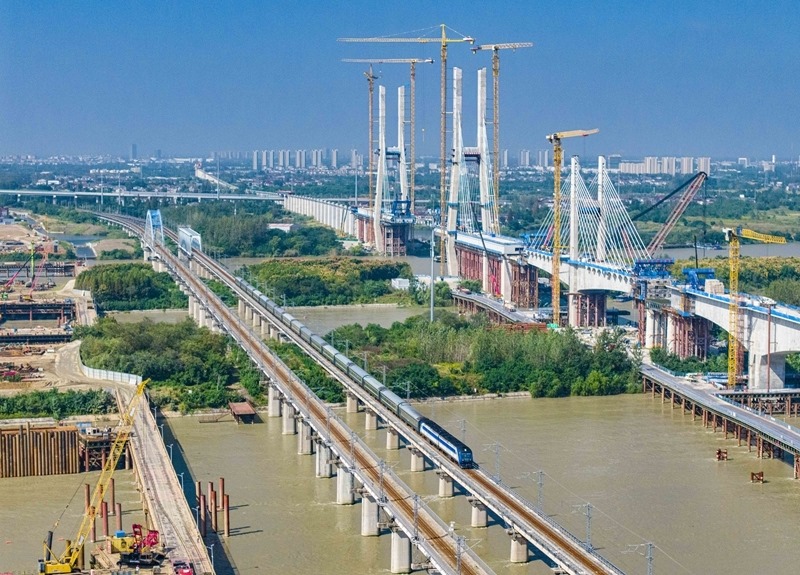 10月10日,列车行驶在宁启铁路江苏扬州段(无人机照片)。