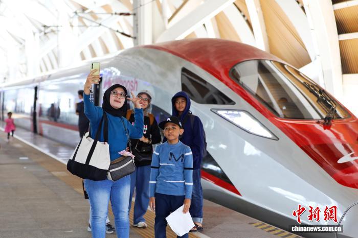 当地时间6月26日,旅客在印尼雅加达哈利姆高铁站与列车合影。雅万高铁由中印尼两国合作建设,最高运营时速350公里。 中新社记者 李志全 摄