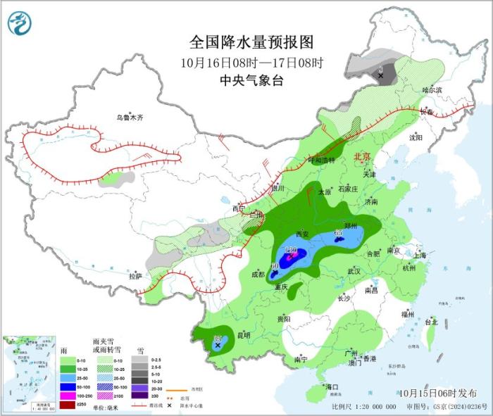 10月16日08时至17日08时,内蒙古东部、黑龙江西部、吉林西部、甘肃西南部、青海东部和南部、西藏东北部等地部分地区有小到中雪或雨夹雪,内蒙古东北部等地部分地区有大雪;四川盆地东部、西北地区东部、黄淮西部、江汉西部和北部、云南西南部等地部分地区有中到大雨,其中,陕西南部、四川东北部、重庆西北部、河南西南部等地部分地区有暴雨或大暴雨(100~120毫米)。新疆南疆盆地、内蒙古中西部、西北地区东部等地部分地区有4~6级风。