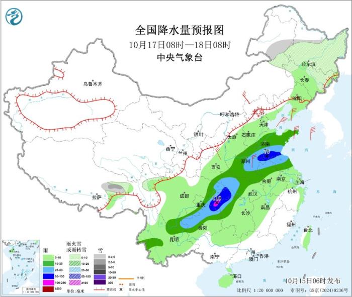 10月17日08时至18日08时,东北地区中北部、内蒙古东北部、西藏东北部等地的部分地区有小到中雪或雨夹雪;华北南部、黄淮、江淮北部、湖北、重庆、贵州中北部、湖南西北部、云南东北部和西南部等地部分地区有中到大雨,其中,山东南部、河南东部、安徽北部、江苏北部、湖北西南部、湖南西北部、重庆东部、贵州东北部等地部分地区有暴雨或大暴雨(100~110毫米)。内蒙古中东部、华北北部和东部、黄淮、江淮等地部分地区有4~6级风。