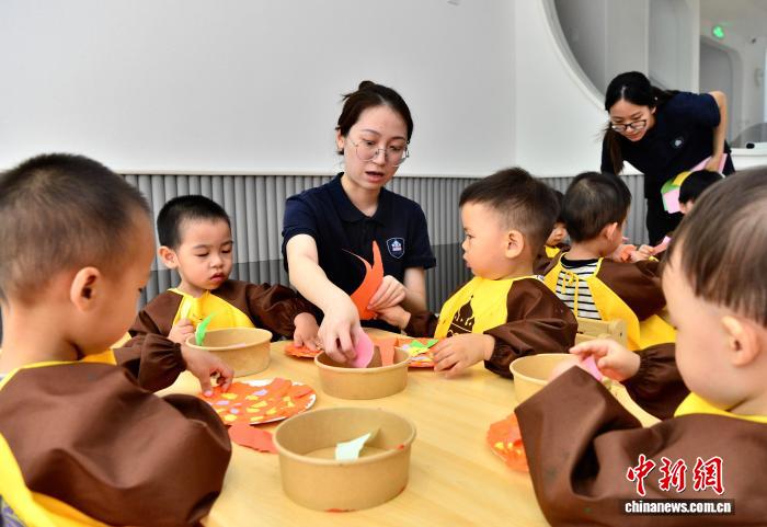 7月29日,福州新星托育园东街园老师指导小朋友进行艺术创想,制作美味的“披萨”。近年来,当地积极推动公办幼儿园和社会力量兴办发展托育教育服务,以解决民众“带娃难”的问题。 中新社记者 张斌 摄
