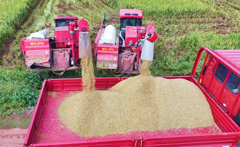 10月17日,在湖南省永州市道县梅花镇梅花村,水稻种植大户采用大型机械收获稻谷(无人机照片)。