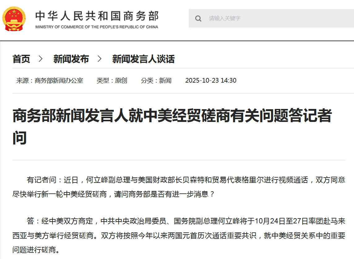 有记者问:近日,何立峰副总理与美国财政部长贝森特和贸易代表格里尔进行视频通话,双方同意尽快举行新一轮中美经贸磋商,请问商务部是否有进一步消息?