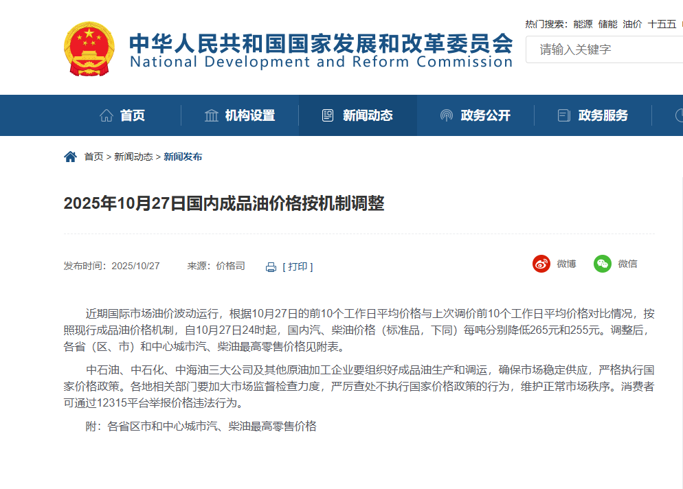 中国网10月27日讯 据国家发改委网站消息,近期国际市场油价波动运行,根据10月27日的前10个工作日平均价格与上次调价前10个工作日平均价格对比情况,按照现行成品油价格机制,自10月27日24时起,国内汽、柴油价格(标准品,下同)每吨分别降低265元和255元。调整后,各省(区、市)和中心城市汽、柴油最高零售价格见附表。