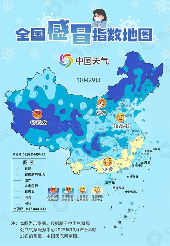 从中国天气网推出的全国感冒指数地图来看,10月29日我国北方大部属于容易感冒的区域,10月30日至31日,随着新一股冷空气登场,容易感冒的区域有所增加,超15省份易引发感冒。