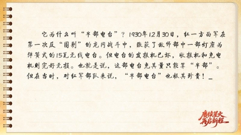 它为什么叫“半部电台”?1930年12月30日,红一方面军在第一次反“围剿”的龙冈战斗中,缴获了敌师部中一部灯座为弹簧式的15瓦无线电台。但电台的发报机已坏,收报机和充电机则完好无损。也就是说,这部电台充其量只能算“半部”。但在当时,对红军部队来说,“半部电台”也极其珍贵!