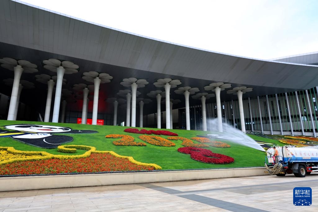 11月3日,工作人员在为国家会展中心(上海)南广场装饰绿化喷水。