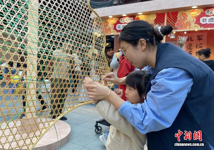 11月14日,2025豫园非遗季在上海豫园商城开幕。图为小朋友体验竹编。中新社记者 郑莹莹 摄