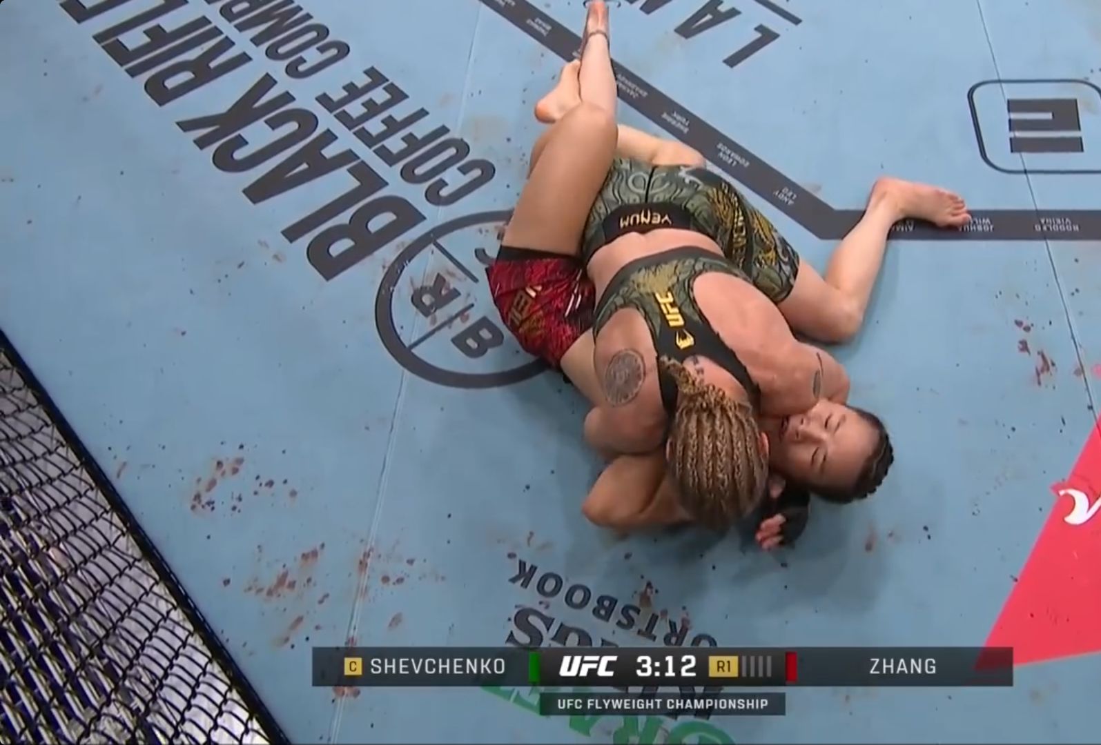 比赛中,两人长时间在地面上缠斗,而舍甫琴科是明显占优的一方。