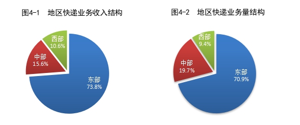 1—10月,东、中、西部地区快递业务收入比重分别为73.8%、15.6%和10.6%,快递业务量比重分别为70.9%、19.7%和9.4%。与去年同期相比,东部地区快递业务收入比重下降0.9个百分点,快递业务量比重下降1.7个百分点;中部地区快递业务收入比重上升0.6个百分点,快递业务量比重上升1.1个百分点;西部地区快递业务收入比重上升0.3个百分点,快递业务量比重上升0.6个百分点。