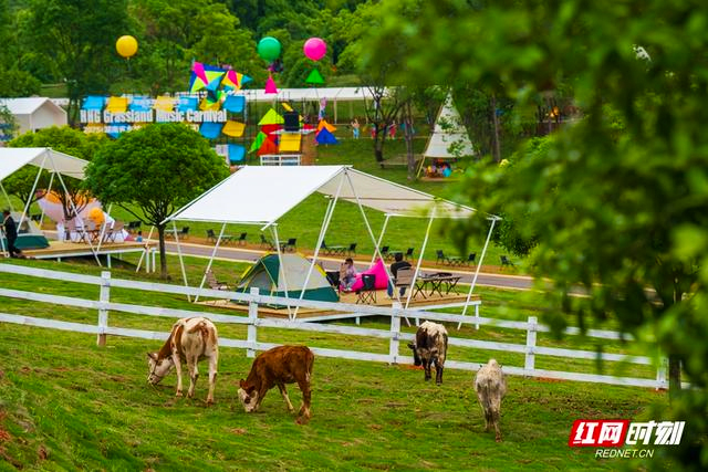 在景区内看到,几头黄牛在围栏内悠闲踱步,远处白色帐篷点缀草地,彩色气球悬空,标识牌上写着“草原音乐狂欢节”。这一幕,成为景区从“田园牧歌”走向“时尚秀场”的缩影。