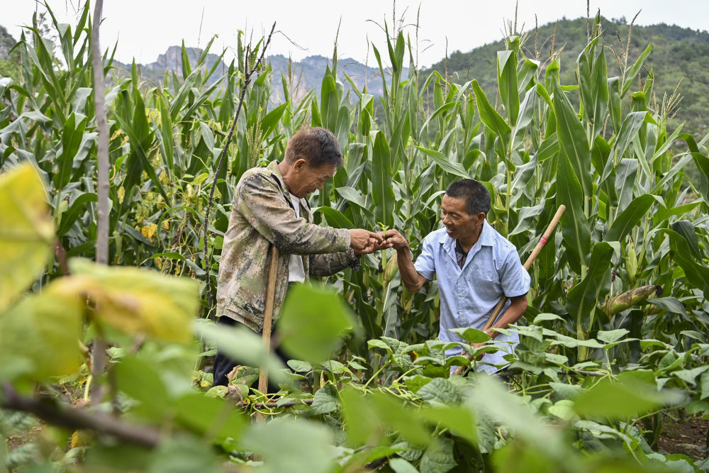 ↑村民桑建平(左)为秦海松夹菜(2025年8月27日摄)。