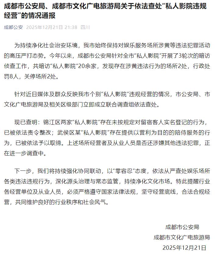 据“成都公安”微信公众号消息,12月21日晚,成都市公安局、成都市文化广电旅游局发布关于依法查处“私人影院违规经营”的情况通报:今年以来,成都市公安局针对全市“私人影院”开展了3轮次的暗访侦查工作,共暗访“私人影院”20余家,发现存在涉黄违法行为的场所2处,行政处罚8人,关停场所2处。