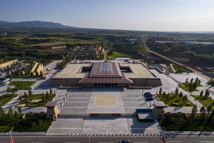 从空中俯瞰陶寺遗址博物馆,外观设计呈现一个“中”字。(资料图)新华网发(王梓轩摄)