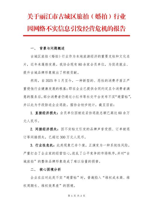 今年10月,丽江市古城区旅拍行业协会发布的《关于丽江市古城区旅拍(婚拍)行业因网络不实信息引发经营危机的报告》。