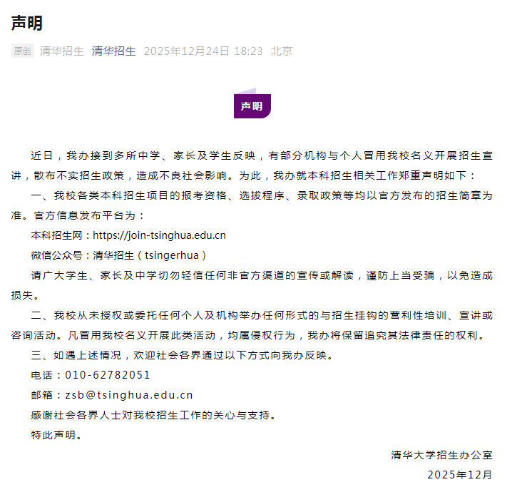 据“清华招生”微信公众号消息,清华大学招生办公室24日发布声明称,近日,清华大学招生办公室接到多所中学、家长及学生反映,有部分机构与个人冒用清华大学名义开展招生宣讲,散布不实招生政策,造成不良社会影响。为此,清华大学招生办公室就本科招生相关工作郑重声明如下:
