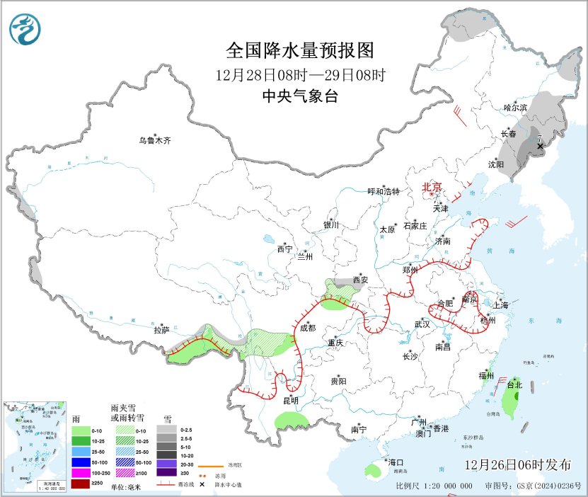 12月28日08时至29日08时,内蒙古东北部、东北地区北部和东部、西藏东南部、陕西南部、四川中部等地部分地区有小雪或雨夹雪,其中,吉林东部等地部分地区有中到大雪(5~7毫米)。西藏东南部、四川中部、云南南部、海南岛中部、台湾岛等地部分地区有小雨,其中,台湾岛东部等地部分地区有中雨。内蒙古东部部分地区有4~6级风;南部海域有5~6级风,阵风7~8级。