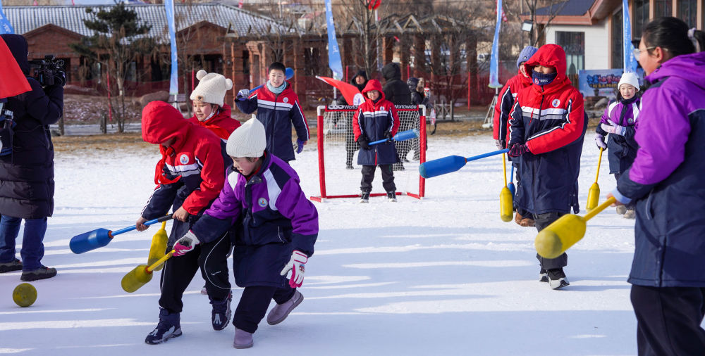 12月3日,吉林市松江东路小学校学生在吉林市纳美山谷度假区体验旱地冰壶。新华社记者 颜麟蕴 摄